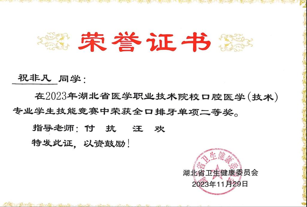 本专业是省级教学资源库建设单位;《全口义齿工艺技术》立项校内一流核心课程;在湖北省医学职业教育口腔医学(技术)技能比赛中,获得“团体三等奖”1项,个人二等奖1项,三等奖3项。每年开展牙体素描、牙体雕刻、全口排牙等比赛,举办口腔修复体制作工职业技能鉴定证书考试,开展爱牙护牙宣传活动,增强群众口腔健康意识,提升群众口腔健康水平。