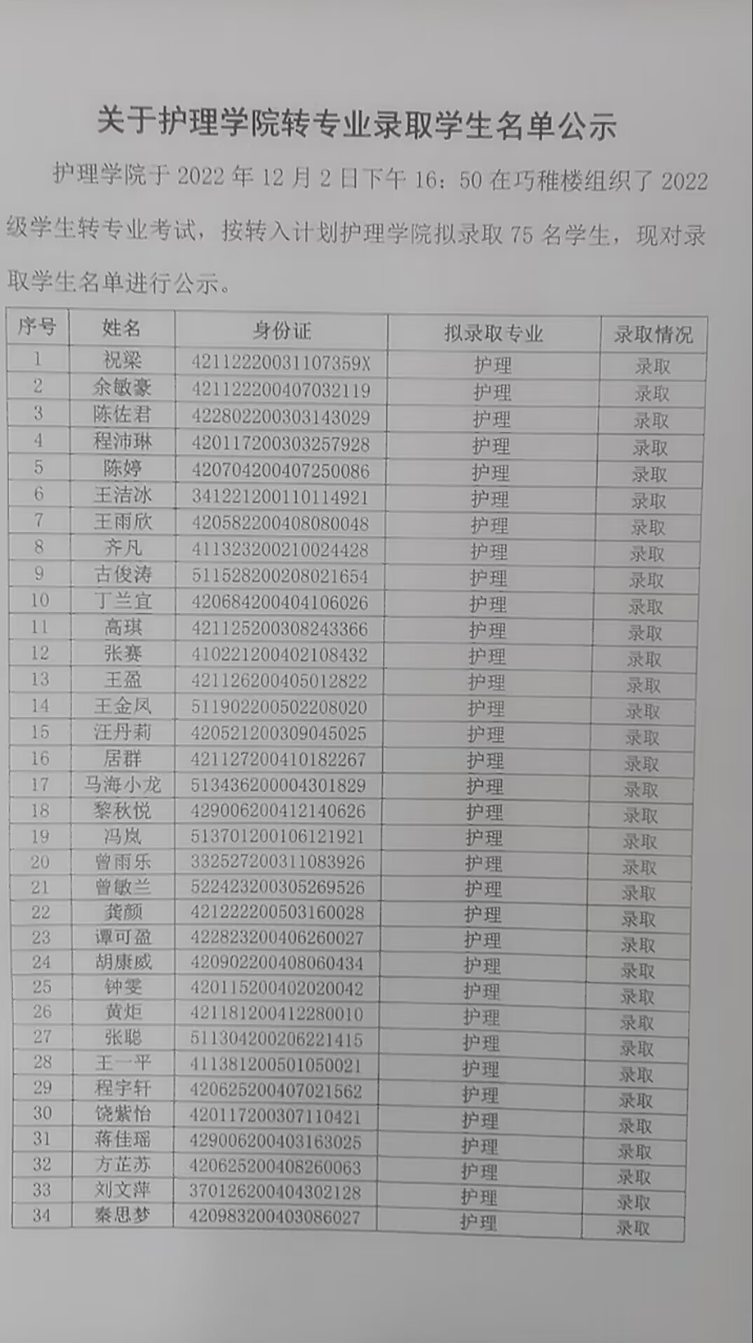 关于beat365在线唯一官网转专业录取学生名单公示