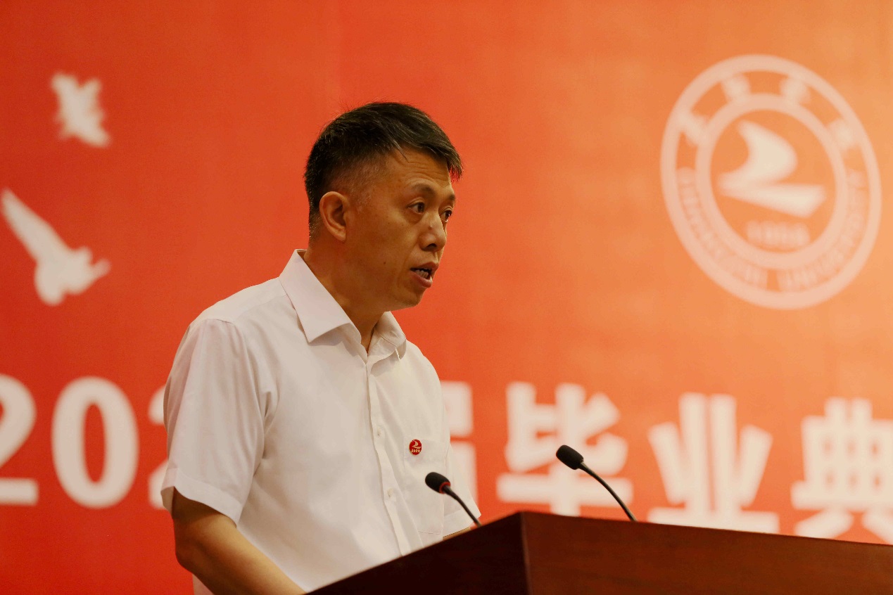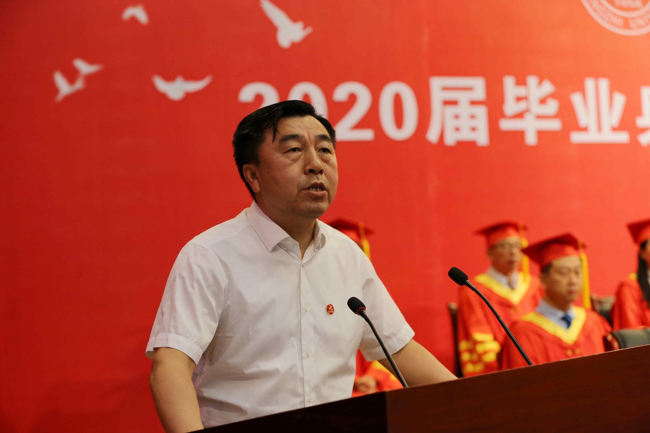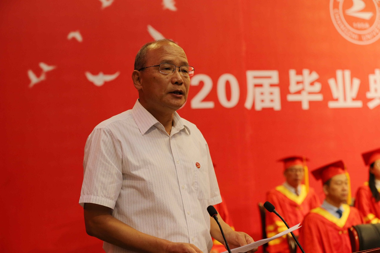 党委副书记、院长茹文明在毕业典礼上致辞。他首先代表学校领导和万余名师生员向2020届全体毕业生致以最热烈的祝贺和最美好的祝愿。他指出,2020年遭遇新冠疫情,同学们没有慌张,没有被疫情所吓倒,而是积极调整心态,很快适应了新的学习模式;大家克服生活上的困难,服从学校关于疫情防控的各项管理措施;大家忙碌于各种线上招聘,紧抓每一次就业机会;大家主动成为志愿者,为学校和社区的疫情防控贡献爱心与力量。在这个过程中,766全讯白菜网涌现出了一大批优秀的榜样,他们没有因为遭遇疫情而怨天尤人,反而将其作为人生的一种宝贵的财富和难忘的回忆同。同时,对毕业生提出几点希望与嘱托:
