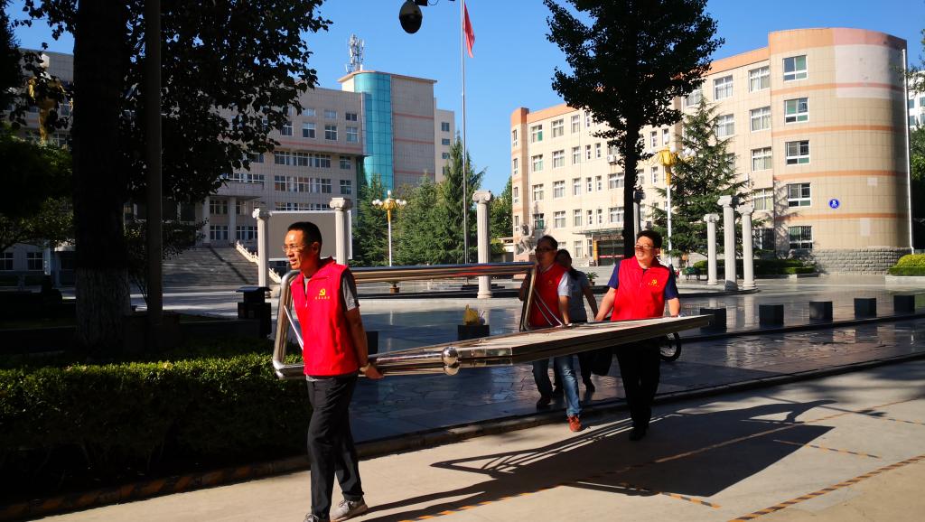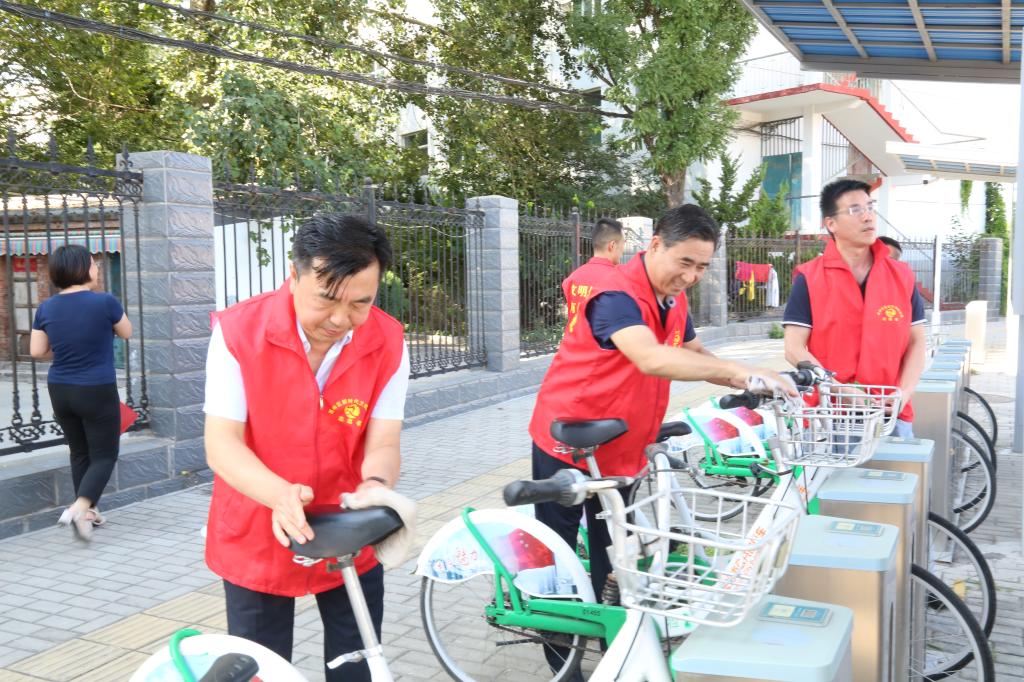 9月1日下午,党委书记郝勇东,党委副书记、院长茹文明带领党员志愿者提着水桶、抹布来到潞阳门北路擦洗公共自行车。从车把手到坐垫,从车轮到车身,志愿者们认真擦洗公共自行车的每一部分,保证让大家骑上干净的自行车,努力践行绿色出行理念。