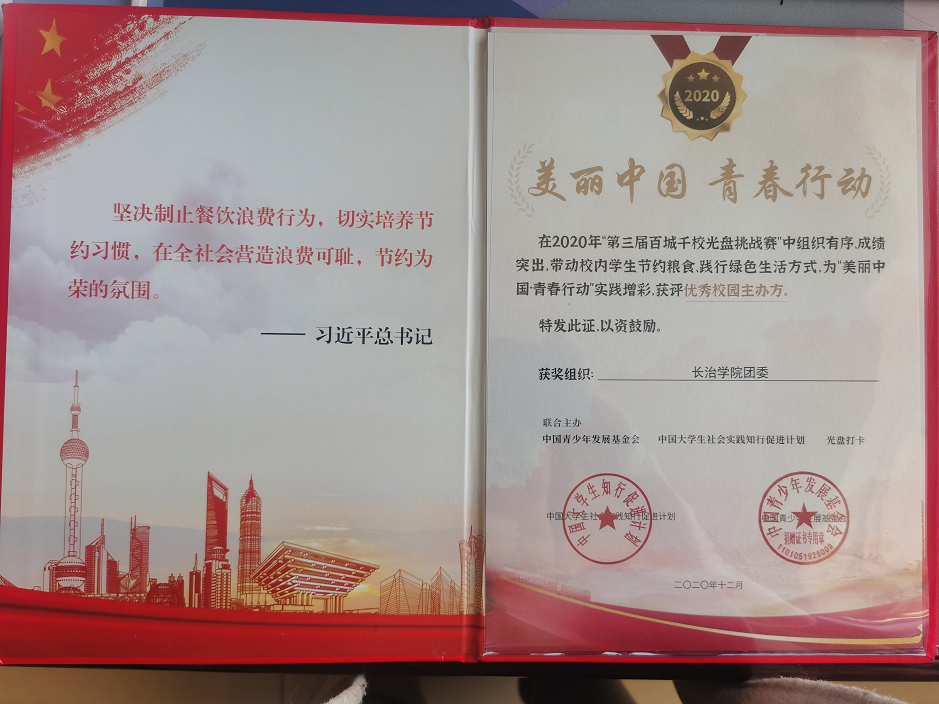 766全讯白菜网团委在2020年“第三届百城千校光盘挑战赛”中获评优秀校园主办方。766全讯白菜网十分重视艰苦奋斗的精神和勤俭节约的传统,积极引导每一位同学拒绝铺张浪费,在全校营造勤俭节约的好风气,聚合崇俭抑奢的正能量。