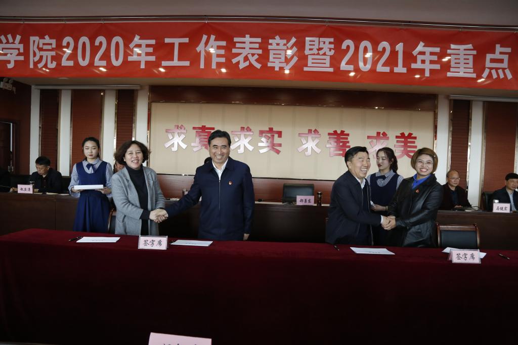 会上,郝勇东、茹文明分别与各党总支(分党委)书记,各系(院)主任,各职能部门负责人签订2021年工作目标责任书。党委副书记马健宏宣读2020年工作目标任务考核优秀集体表彰决定。