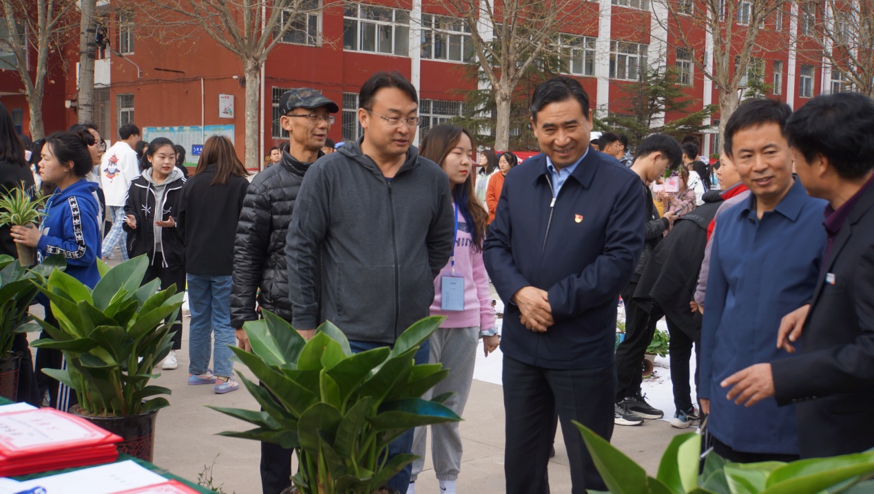 党委书记郝勇东专程来到花卉盆景制作体验活动现场。他兴致勃勃地观看同学们制作作品,不时询问作品的构思、创意、材料、寓意,对同学们积极参加活动、丰富的想象力、创造力和对党无比热爱之情给予了高度评价,并祝本次活动圆满成功。