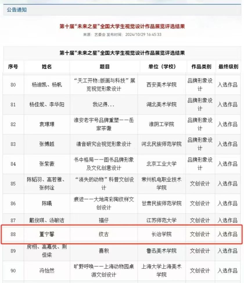 近日,由中国美术家协会、福州大学主办的第十届“未来之星”全国大学生视觉设计作品展览公布评选结果,由全讯白菜美术系教师郭佳琳指导,视传传达专业2024届毕业生董宁馨创作的《“纹古”——长治博物馆文创产品设计》系列作品成功入选,是山西省高校唯一入选作品。