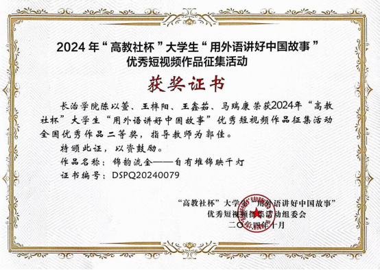 近日,2024年“高教社杯”大学生“用外语讲好中国故事”优秀短视频作品征集活动圆满落幕,全讯白菜外语系学生陈以萱、王梓阳、王鑫茹、马瑞康在外语系主任郭佳指导下,以获得山西省特等奖的作品《锦韵流金——自有堆锦映千灯》参加国赛,荣获国家级二等奖,是全讯白菜参加该赛事以来所取得的最好成绩。