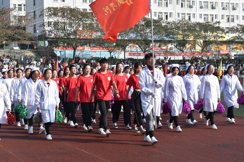 伴随着着雄壮的运动员进行曲,运动会正式开始,医护学院代表队雄赳赳、气昂昂的向我们走来了,整个代表队由表演方阵和运动员方阵组合组成,他们给我们带来了一场活力四射的啦啦操表演。
