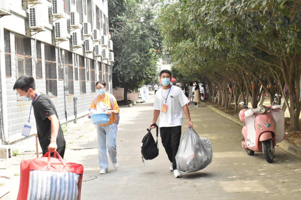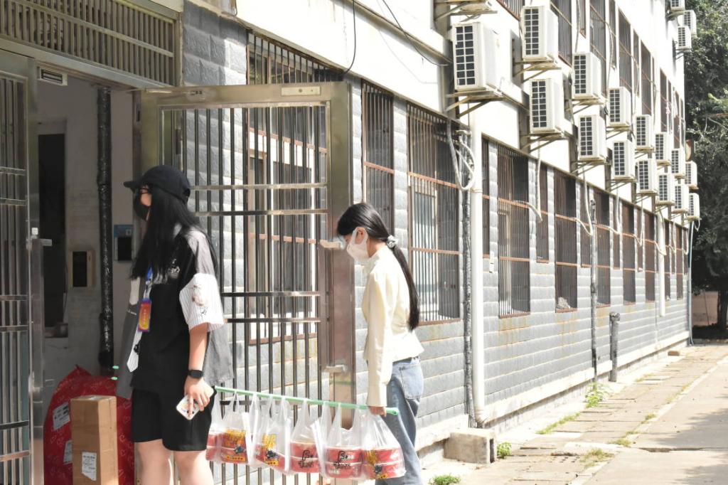 由于疫情,家长与车辆不得入校,志愿者们便帮助新生们提起沉甸甸的行李,将新生们送至宿舍区报到。新生们进入宿舍后便不得再离开宿舍,需在宿舍“封控”5天,这5天内的食宿将由志愿者负责,于是,便有了以下场景:
