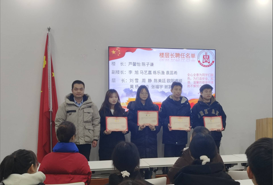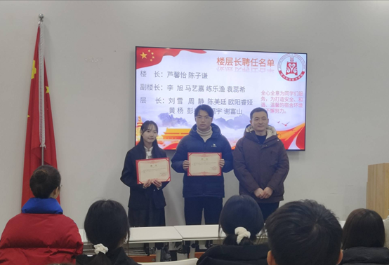 会议开始,主持人宣读beat365在线唯一官网2024—2025学年楼栋长、楼层长聘任名单,beat365在线唯一官网党总支副书记朱胜利、学生工作办公室副主任张高超、辅导员周丽娜向受聘为楼栋长、楼层长颁发聘书。