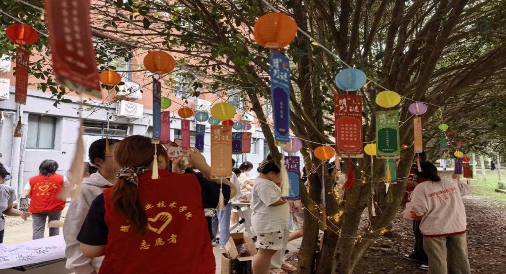 活动现场,一系列沉浸式文化体验让师生们尽情领略中秋魅力。“寄语传情”区,同学们提笔挥毫,让思念浸润墨香;“趣味投壶””区,团队协作间迸发出阵阵欢呼;“智慧灯谜””区,思维的碰撞闪烁着传统智慧的火花。老师们也欣然融入,与学生们畅谈习俗、分享趣闻。欢声笑语间,校园大家庭的温暖与和睦深入人心,一颗名为“温情”的种子在此刻悄然种下。