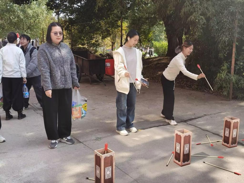活动现场设置了多个趣味互动环节。在彩绘展板区,同学们写下温暖寄语,用色彩传递情绪正能量;投壶游戏区笑语不断,大家在传统游戏中放松身心;情绪便利贴墙成为“心灵树洞”,构建了烦恼与祝福双向治愈的纽带;手绘减压环节则让同学们通过画笔畅快释放情绪。“把不开心写下来,再看到满板的祝福,心里一下子亮了。”参与活动的同学说。