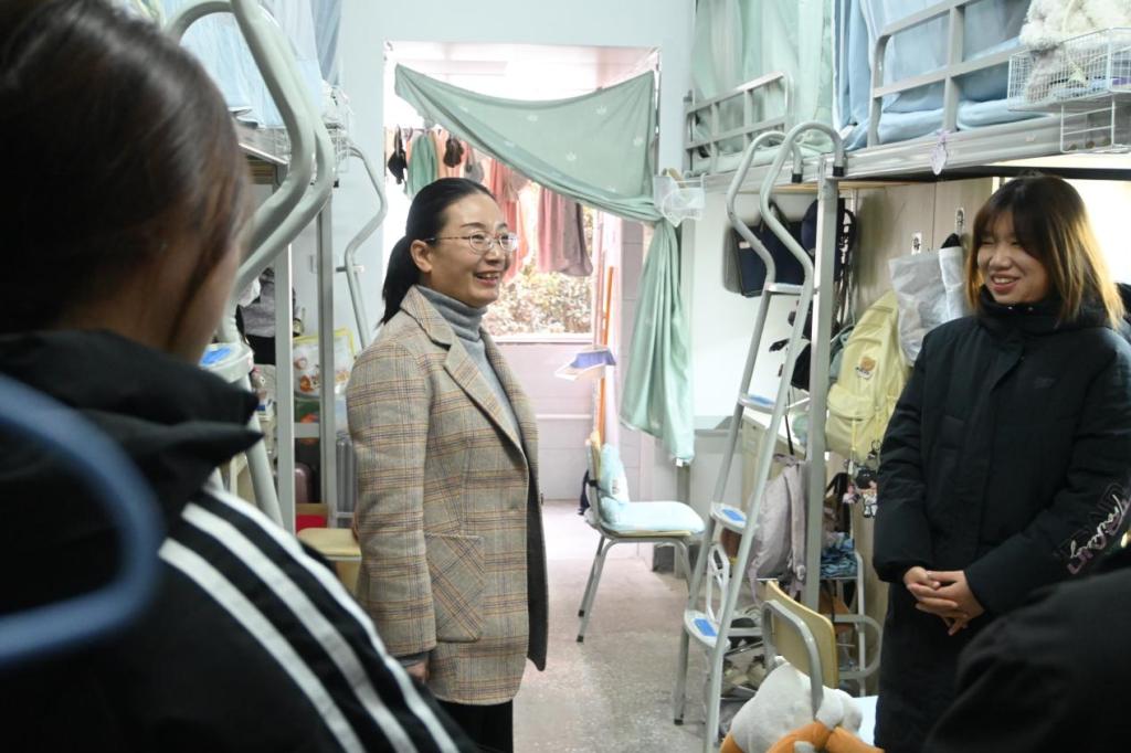随后,魏丹一行走访了3栋222等学生宿舍,实地察看住宿环境与生活设施,与同学们亲切交谈,细致询问他们的住宿感受与生活需求。她叮嘱同学们要增强安全意识,互帮互助,共同维护安全、文明、和谐的宿舍家园。