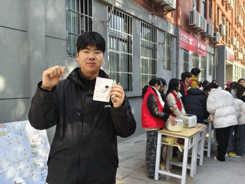 在“祝福卡片区”,同学们在精心布置的长桌前驻足,提笔在卡片上写下真挚的感恩与祝福。这些满载心意的卡片,有的被亲手赠予师长、同窗,有的则轻轻贴在感恩展示板上,汇聚成一片温暖的语言风景。老师们也参与其中,通过“感恩盲盒”为同学们悄悄写下鼓励与祝愿,引导大家主动表达、勇敢言谢。一字一句,皆为情意,让感恩在文字间流淌出独特的温度。