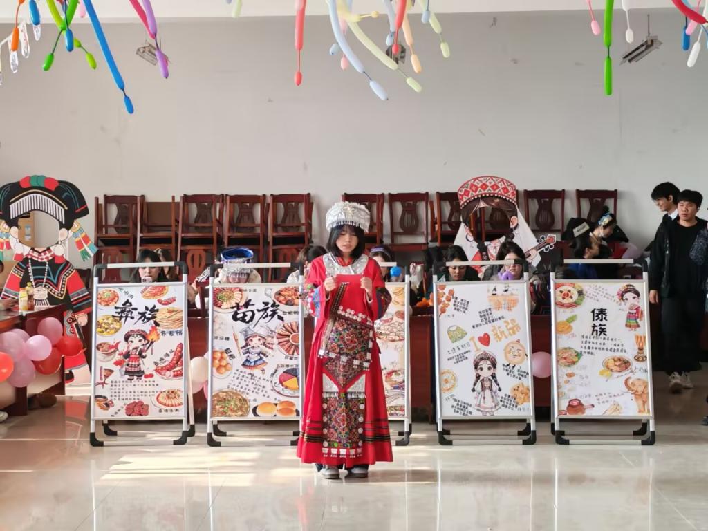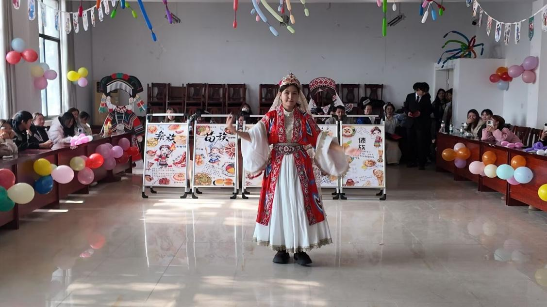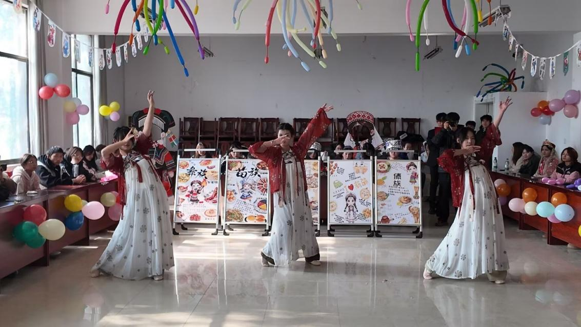 活动通过“文化展演”与“实践体验”两个篇章生动展开。展演环节,陈雅同学演绎的古典舞《丽人行》风韵典雅,展现了中华优秀传统文化的深厚底蕴;阿依古再同学带来的维吾尔族舞蹈《石榴花开》热情灵动,绽放出民族文化的绚丽多彩。两个节目同台辉映,是中华文化多元一体、美美与共的生动写照。体验环节,全体师生自发携手,围成象征团结的“同心圆”翩然共舞。在欢快的旋律中,情感得以交融,“民族团结一家亲”的和谐氛围洋溢全场。