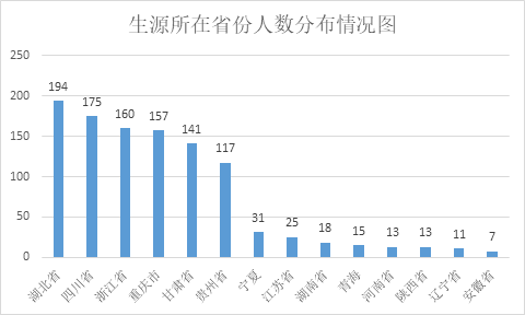 湖北籍生源194人,非湖北籍生源926人,省外生源占比86.68%。省外生源主要来自四川省175人,浙江省160人,重庆市157人,甘肃省141人,贵州省117人,宁夏30人,江苏省25人,湖南省18人,青海省15人,其它地区合计88人。