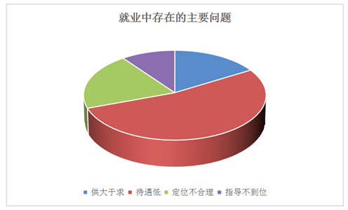82.6%的毕业生对就业总体满意,17.4%的毕业生存在不同程度问题。(在这部分学生中的16.34%的毕业生认为毕业生供大于求,53.12%的毕业生认为待遇过低,20.46%的毕业生认为就业定位不合理、期望值过高,10.08%的毕业生认为就业机制不健全、信息不充分。)