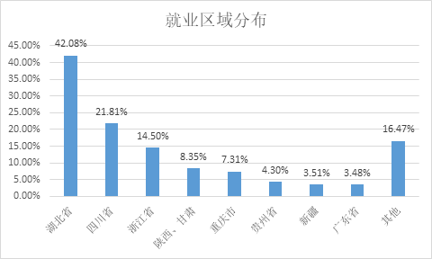 2022届毕业生就业分布较广,部分学生都是回老家就业,有42.08%选择在湖北省就业,21.81%选择回四川省就业,异地就业多喜欢选择浙江(14.50%)就业。