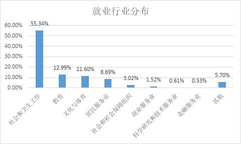 总体来说,卫生行业为毕业生的主要就业去向,超过半数(55.34%)的毕业生进入社会和卫生工作行业,其次是教育行业(12.99%)、文化与体育行业(11.60%)、居民服务业(8.69%),较少选择社会和社会保障组织(3.02%)、商业服务业(1.52%)科学研究和技术服务业(0.61%)、金融服务业(0.53%)。