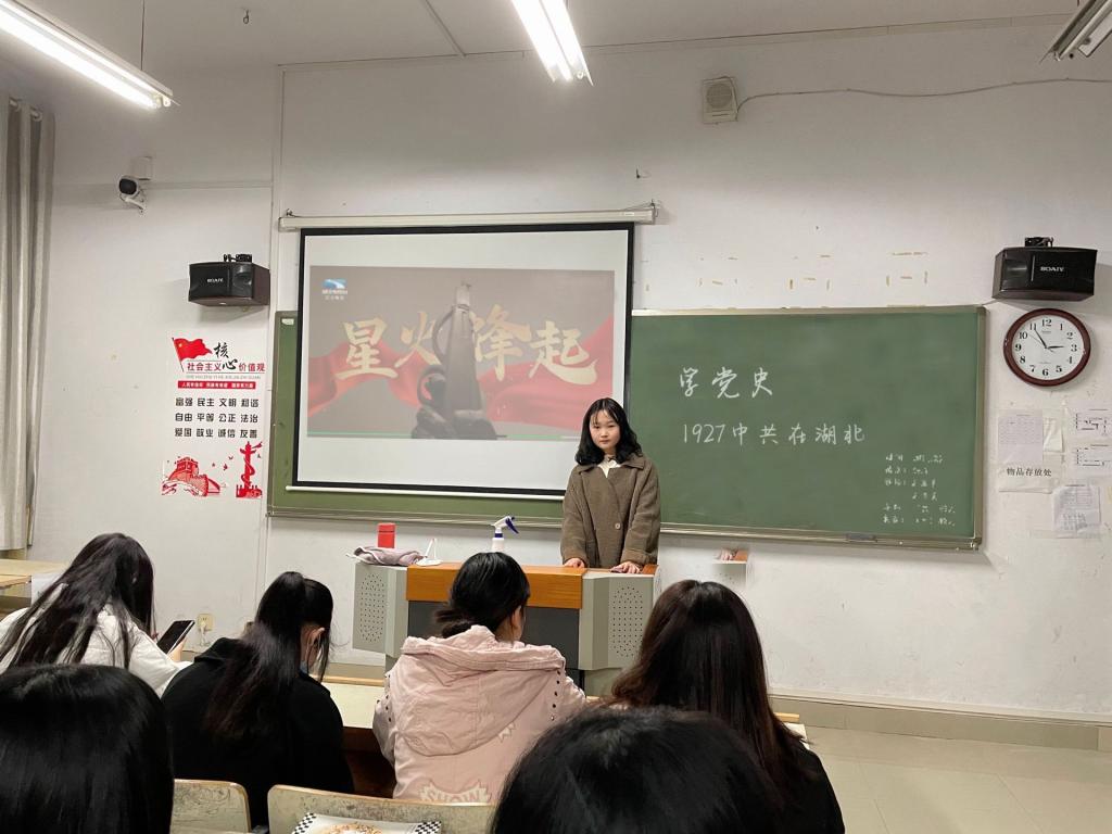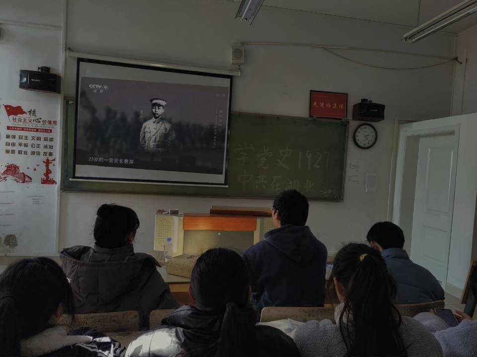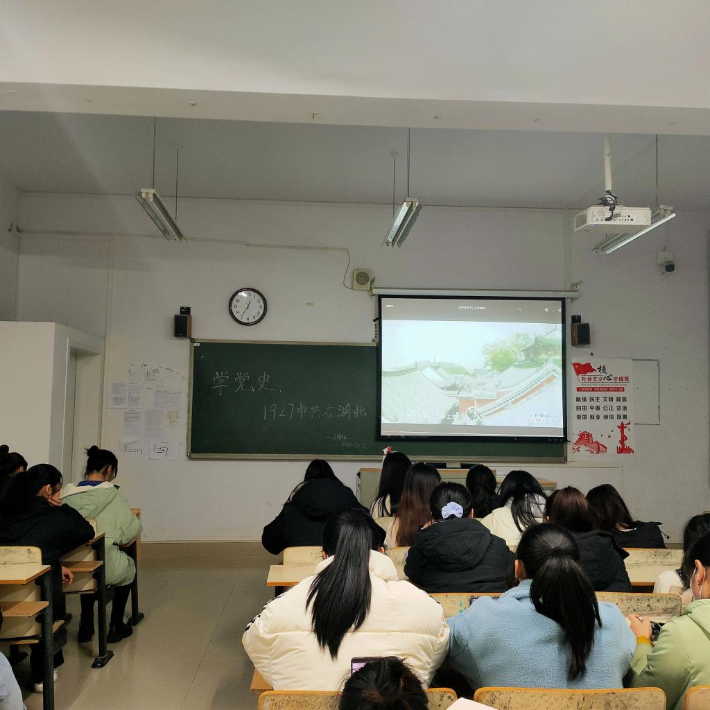 此次主题团日活动旨在让同学们更加了解党的奋斗历程,加强自身建设和社会责任意识。为了让同学们了解党在湖北的光辉实践,各班团支书在班级里组织全班同学观看了《风云江城——1927中共在武汉》专题纪录片。在这一过程中同学们了解到了中国共产党在武汉的发展壮大,同时也了解到了武汉汉口做为八七会议的召开地,会议上确定的实行土地革命和武装反抗国民党反动派的总方针成为了党历史上的一次重大转折。