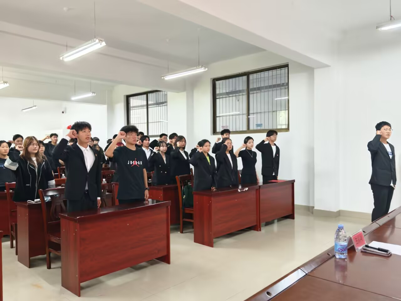 在宣誓人的带领下,全体新团员面向团旗,右手握拳,庄严宣誓:“我志愿加入中国共产主义青年团,坚决拥护中国共产党的领导……” 铿锵有力的誓言在会场回荡,表达了新团员们对共青团组织的无限忠诚和为共产主义事业奋斗的坚定决心。