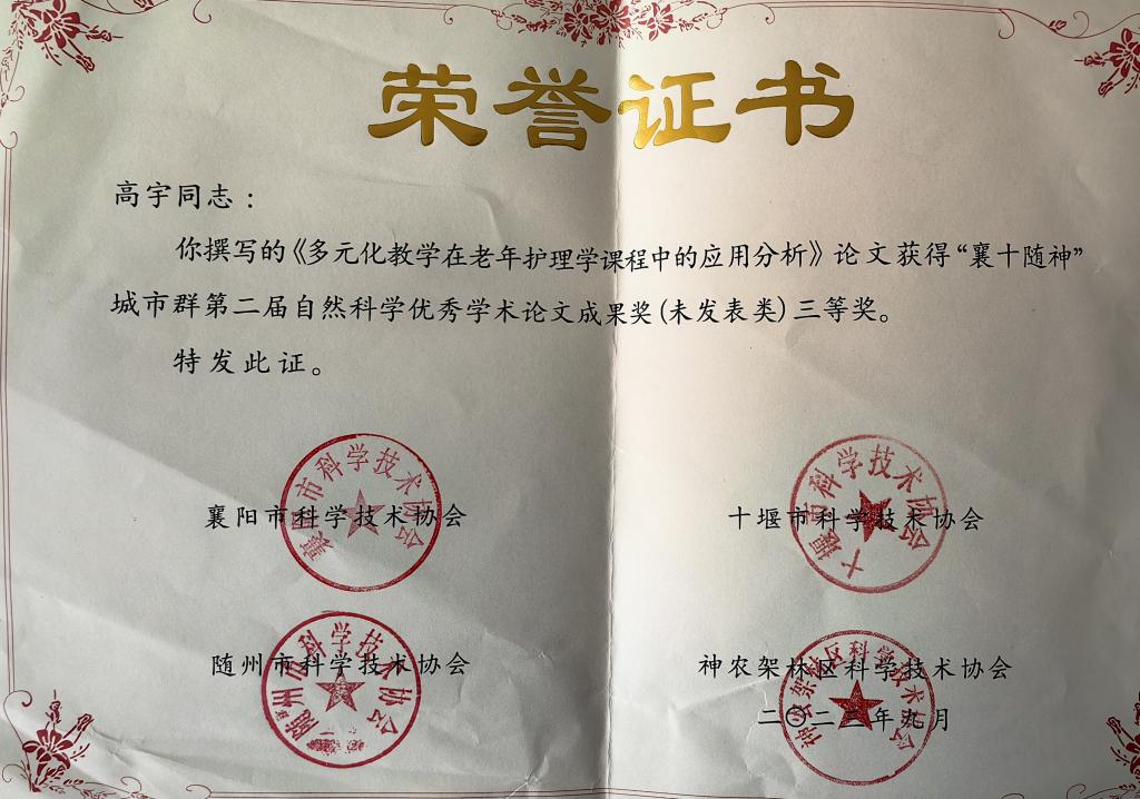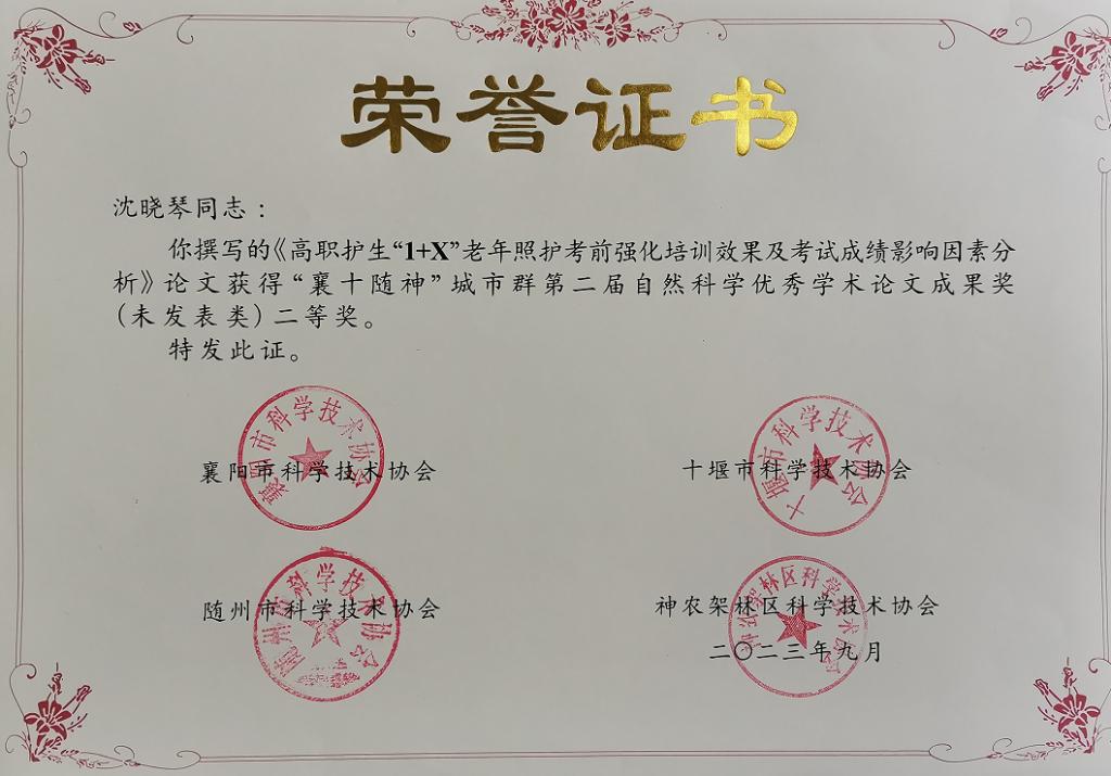 2023年9月20日,“襄十随神”城市群第二届自然科学优秀学术论文成果奖结果公布,beat365在线唯一官网沈晓琴老师论文《高职护生“1+X”老年照护考前强化培训效果及考试成绩影响因素分析》荣获二等奖,高宇老师论文《多元化教学在老年护理学课程中的应用分析 》荣获三等奖。